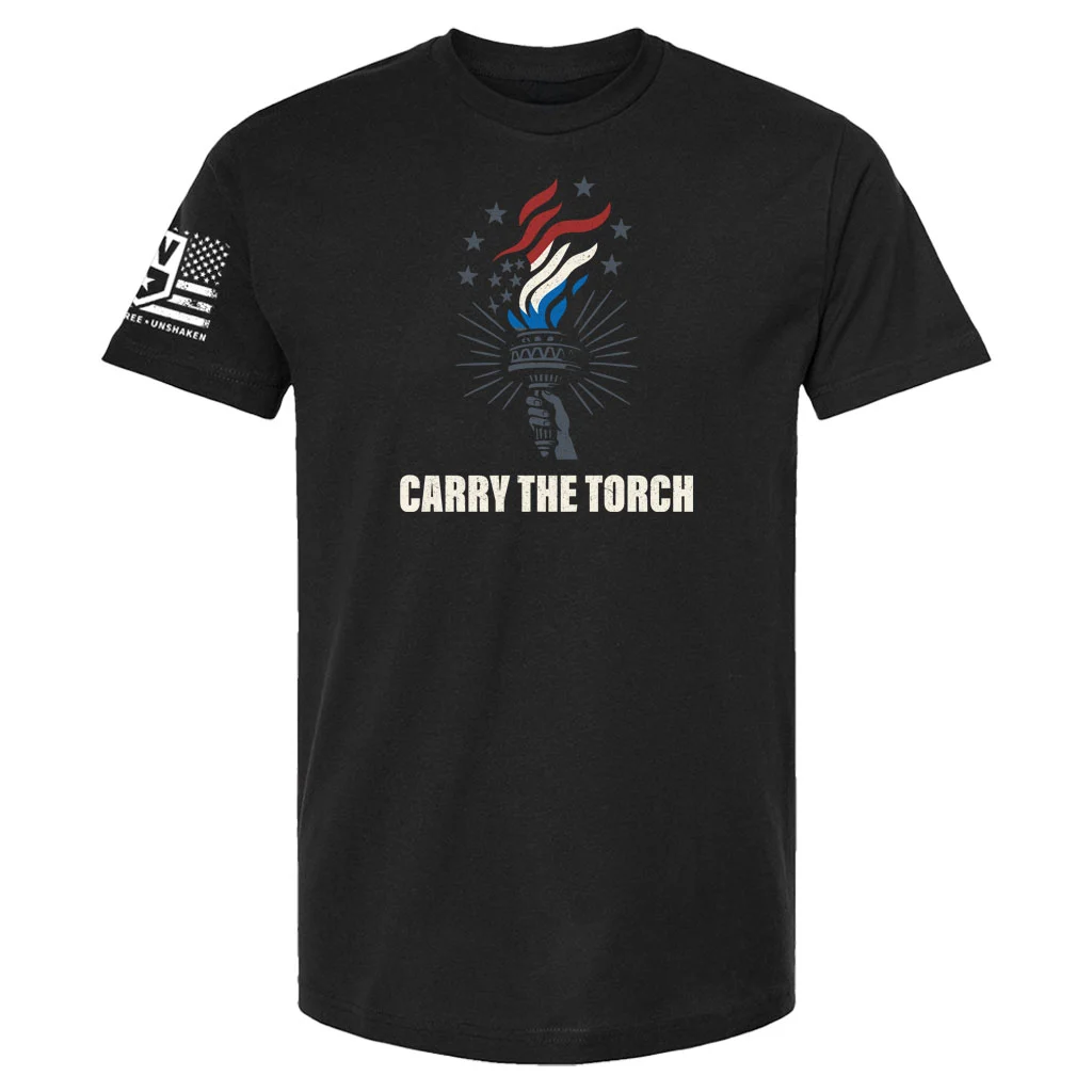 Light the way for future generations. The Carry the Torch Tee is a wearable declaration of unshaken resolve and lasting legacy. At center, a hand-held torch bursts with red, white, and blue flames framed by stars, with “Carry the Torch” printed boldly beneath. A Genuine Valor flag insignia on the left sleeve ties it back to our mission of fearless freedom.