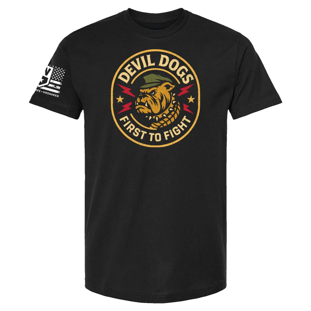 Wear the legacy of the few and the proud. The Devil Dogs Tee pays tribute to the U.S. Marines’ fierce nickname with a striking bulldog graphic framed by crackling lightning and the rallying cry “First to Fight.” Perfect for veterans, patriots, and anyone who stands with our Corps, this shirt sparks respect at the range, the gym, or your next tailgate. Crafted to honor those who lead the charge, it’s more than apparel—it’s a badge of honor. Ready to salute in style? Gear up with the Devil Dogs Tee and carry the fight forward.