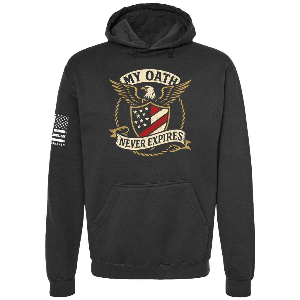 The uniform may come off, but the promise remains. The My Oath Never Expires Hoodie is a tribute to veterans and service members who honor their pledge long after the battlefields. Featuring a bold eagle and shield design framed by a banner of commitment, it’s a powerful reminder of loyalty and sacrifice.