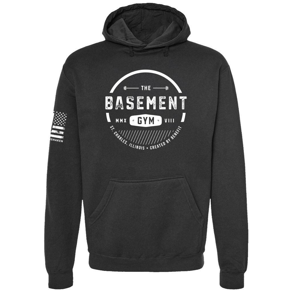 The Basement Gym — clean, bold, and built to work. Premium hoodie with GV sleeve marks.